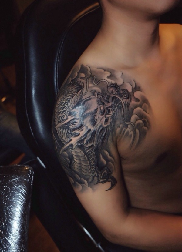 大臂黑白邪龙纹身图片相当帅气