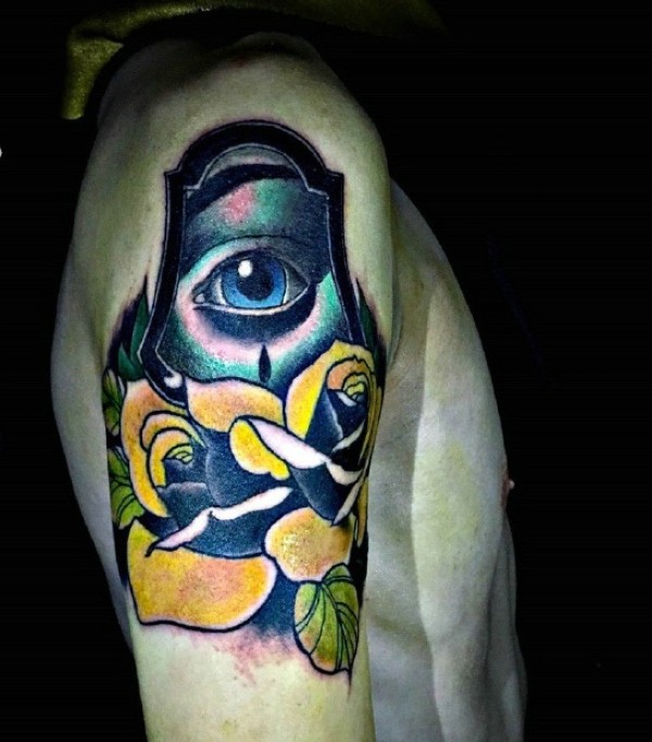 逼真的眼球与花朵结合的大臂3d纹身图案