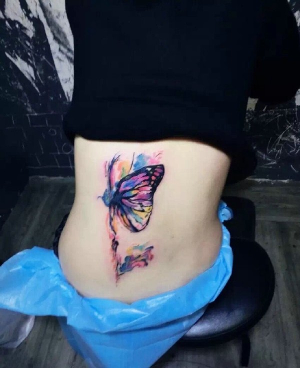 侧腰部的水彩蝴蝶纹身图片很耀眼