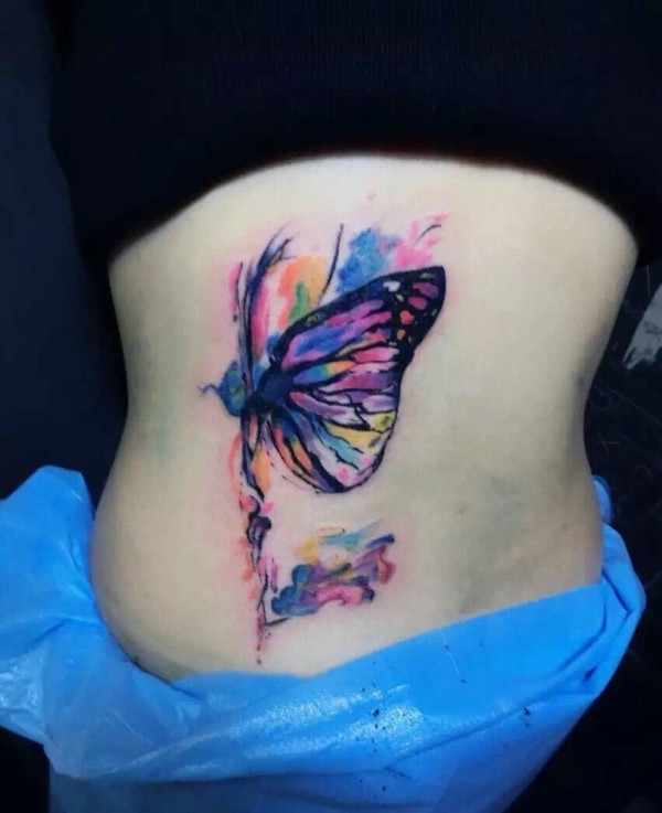 侧腰部的水彩蝴蝶纹身图片很耀眼