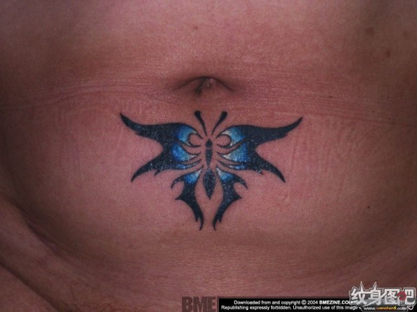肚子上的蓝色闪光蝴蝶纹身