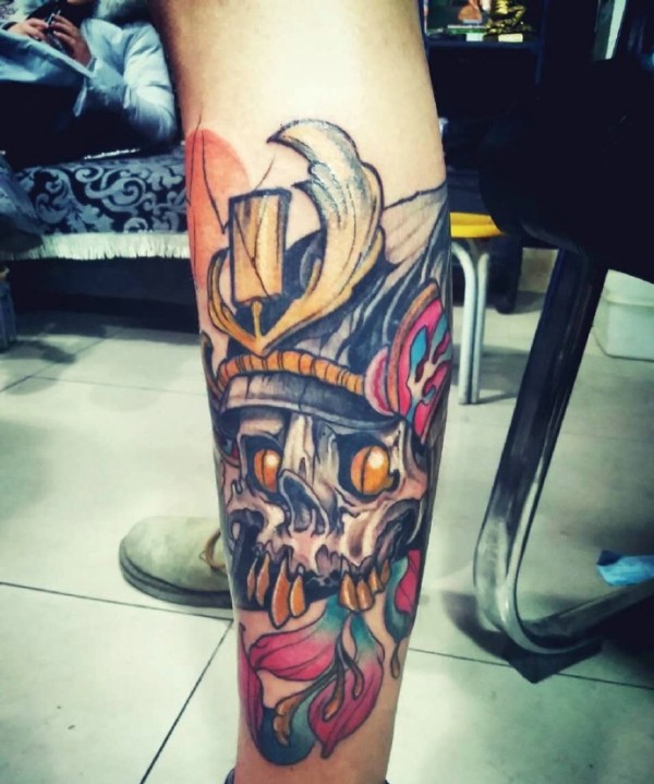 处在小腿部的彩色骷髅头纹身图案