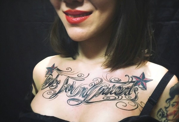 红唇美女胸前花体英文纹身图片