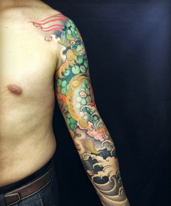 夺人眼球的花臂唐狮纹身图片
