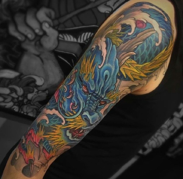 手臂经典彩色邪龙纹身图片