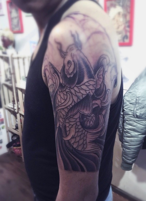 大臂黑白鲤鱼纹身图片年年大旺