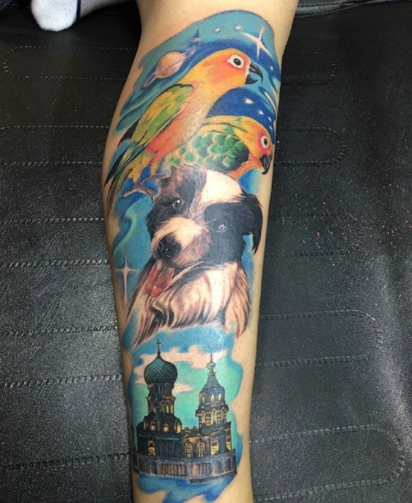 腿部彩色可爱小狗纹身图片