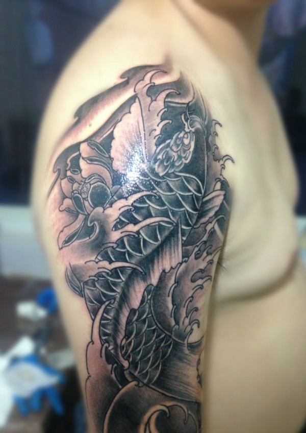 大臂浓浓清晰的黑白鲤鱼纹身图片