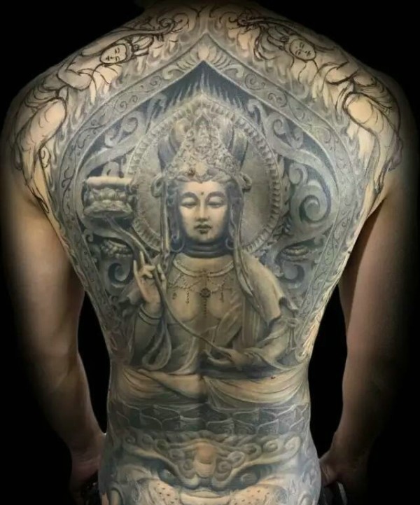 满背黑白观音纹身图片经典个性