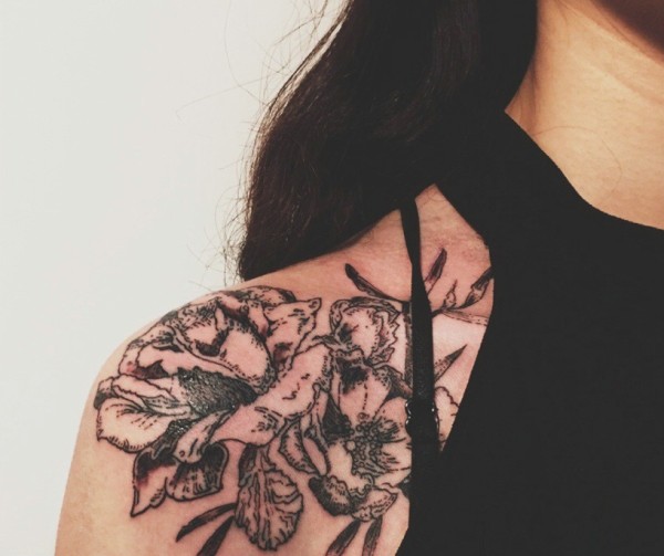女生肩花纹身_15张女性双肩对称的肩花纹身图案作品图片