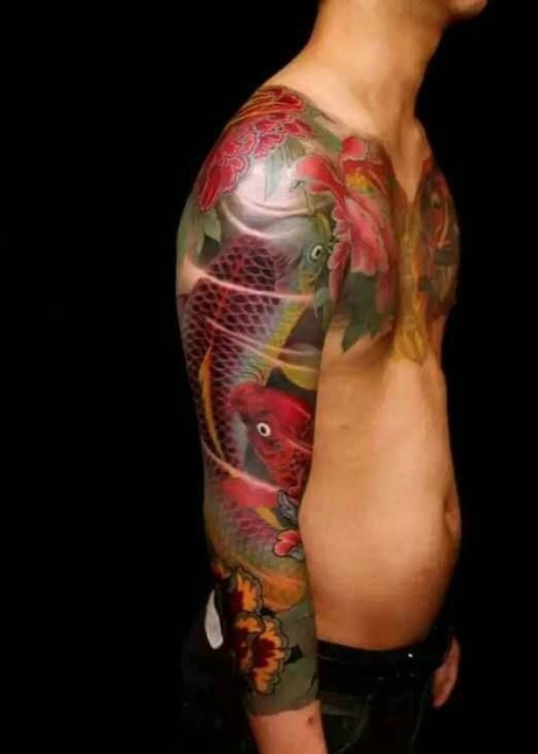 艳丽无比的手臂红鲤鱼纹身图片