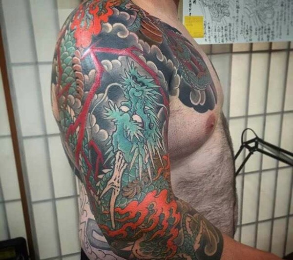 炫酷无比的彩色半甲邪龙纹身图片