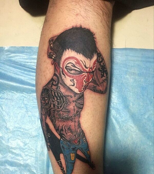 小腿另类彩色人物图腾纹身图片