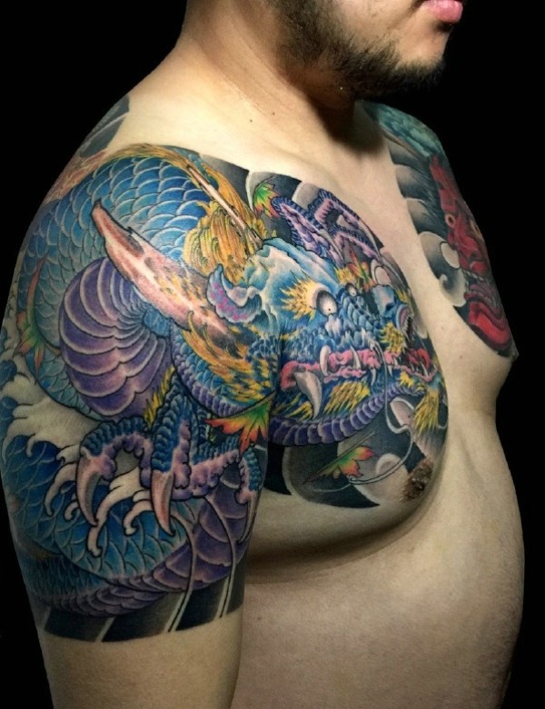 邪龙与般若结合的彩色双半甲纹身图片