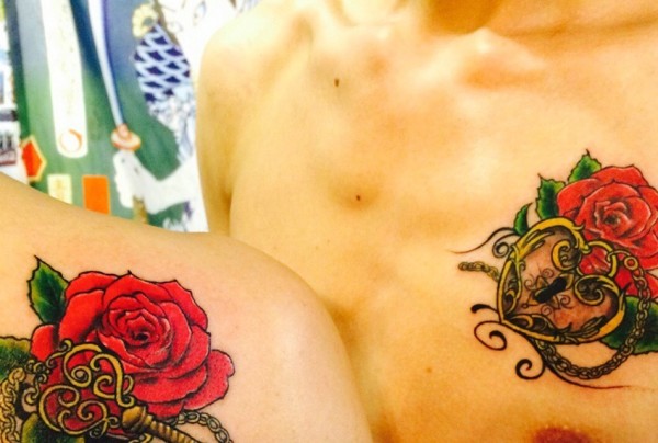 爱心锁与玫瑰花朵结合的情侣纹身图片