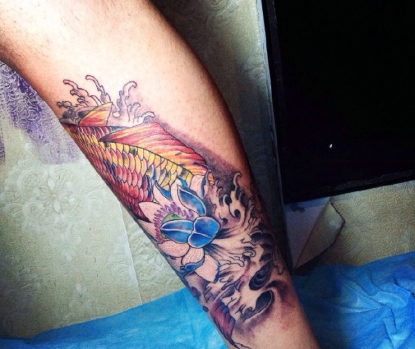 传统鲤鱼花小腿纹身_腿部纹身图案大全_纹身图吧