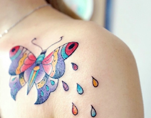 肩膀上的翩翩起舞彩色蝴蝶纹身图片