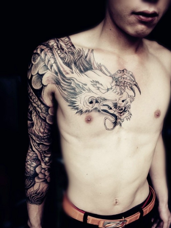 半甲黑白邪龙纹身图片很霸气