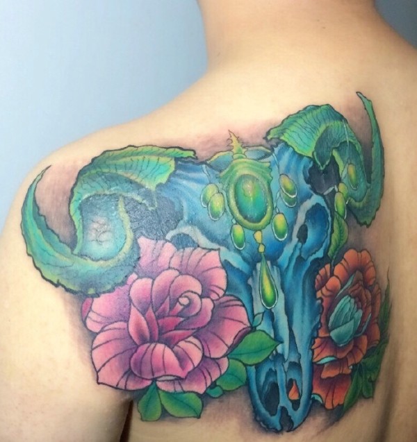 后背颜色不一的美丽花朵纹身图片