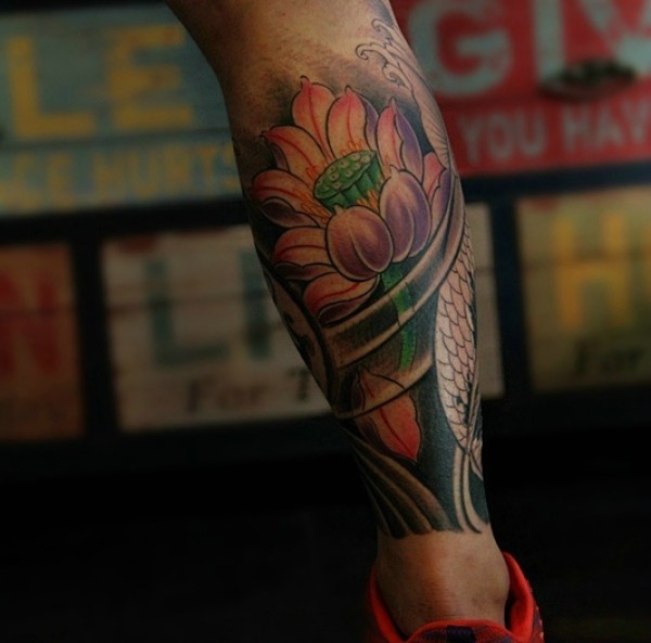 传统鲤鱼花小腿纹身_腿部纹身图案大全_纹身图吧