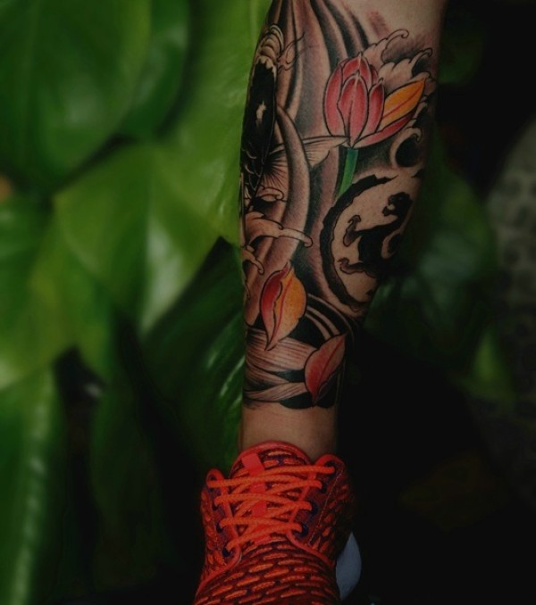 传统鲤鱼花小腿纹身_腿部纹身图案大全_纹身图吧
