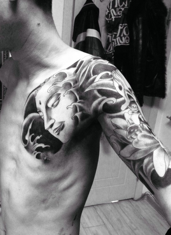 男人大臂黑白彼岸花骷髅_黑白纹身图案大全_纹身图吧