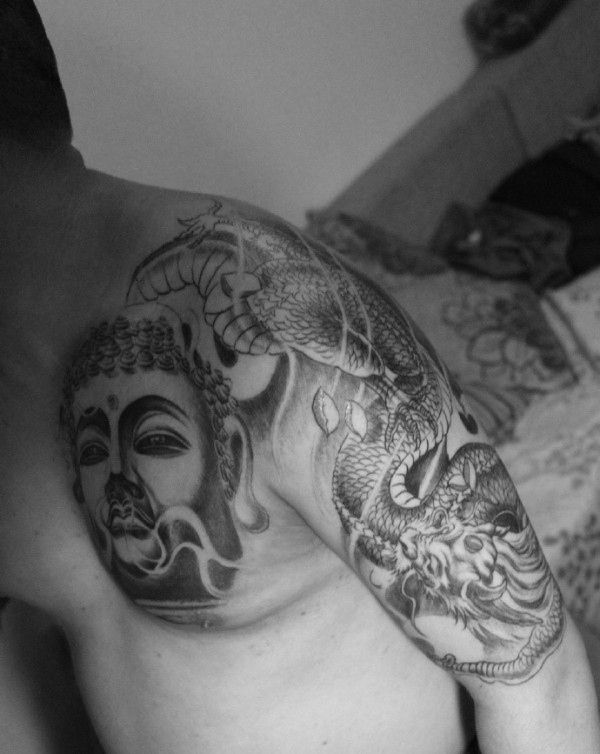 黑白佛像半甲纹身图片帅气无比