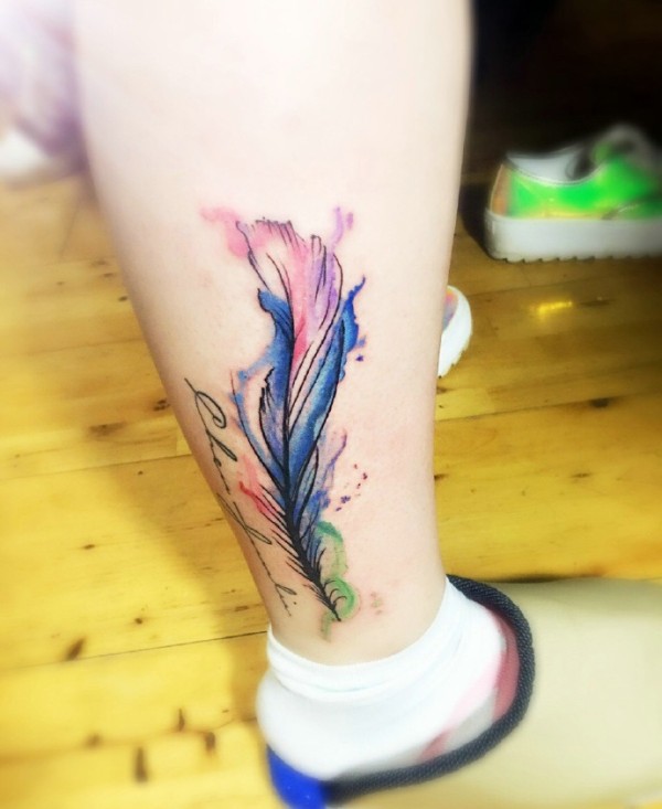腿部外侧五颜六色的羽毛纹身图片