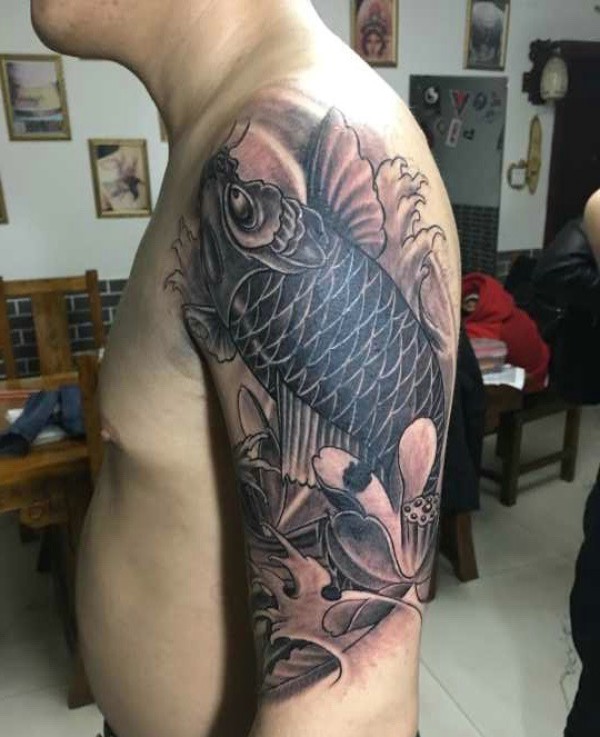 鲤鱼与莲花一起的黑白手臂纹身图片