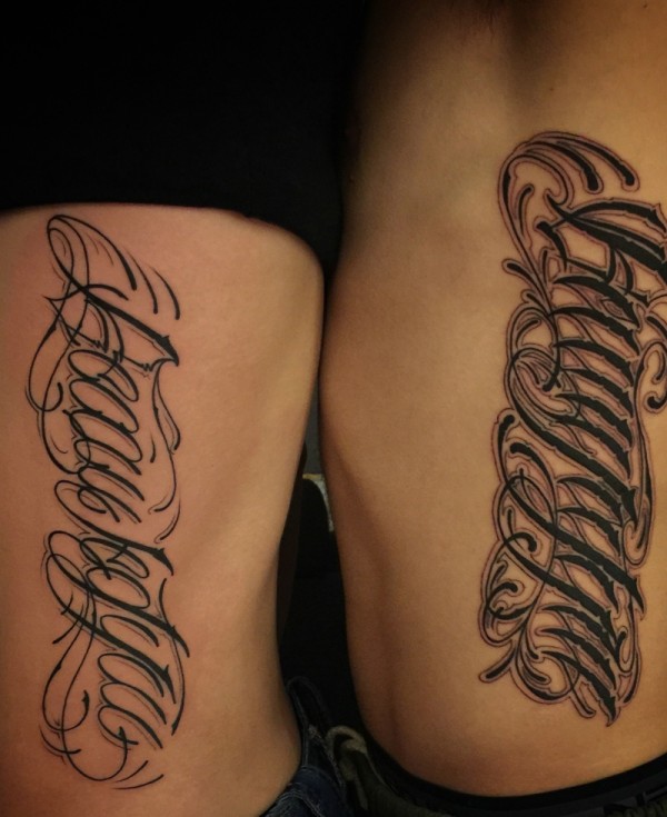 侧腰部的不一样花体英文情侣纹身图片