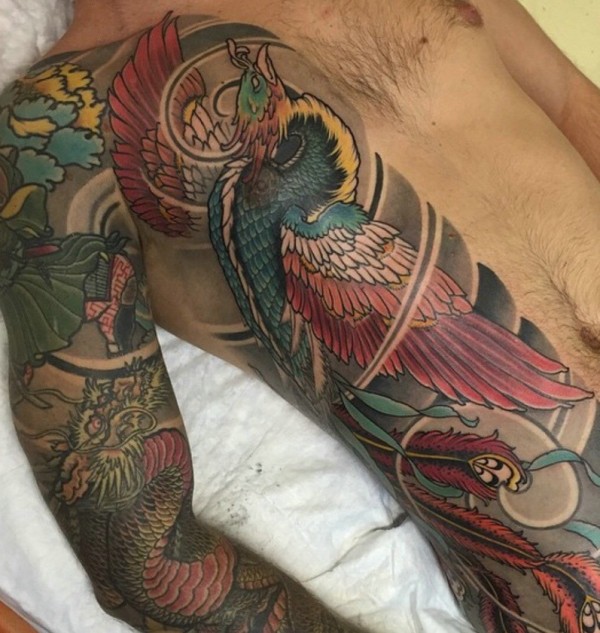 红凤凰与邪龙结合的彩色半甲纹身图片