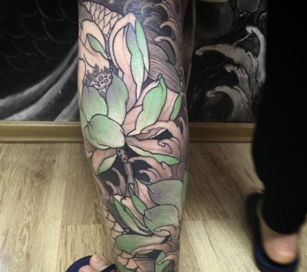 传统鲤鱼花小腿纹身_腿部纹身图案大全_纹身图吧