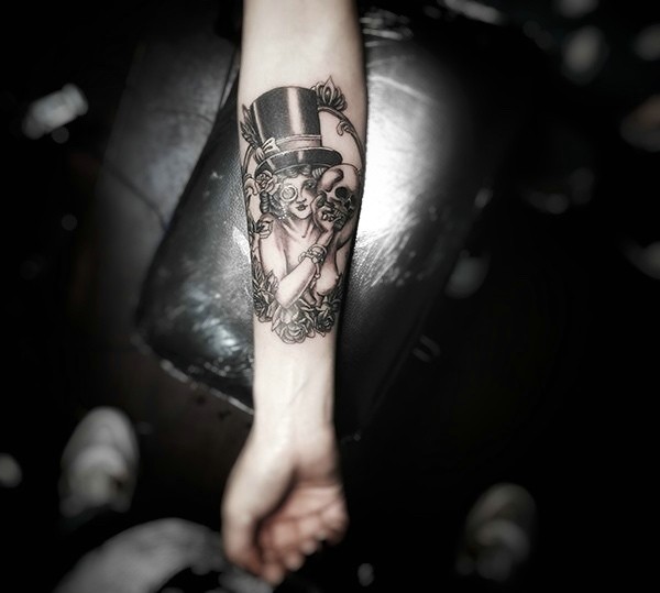 男人大臂黑白彼岸花骷髅_黑白纹身图案大全_纹身图吧