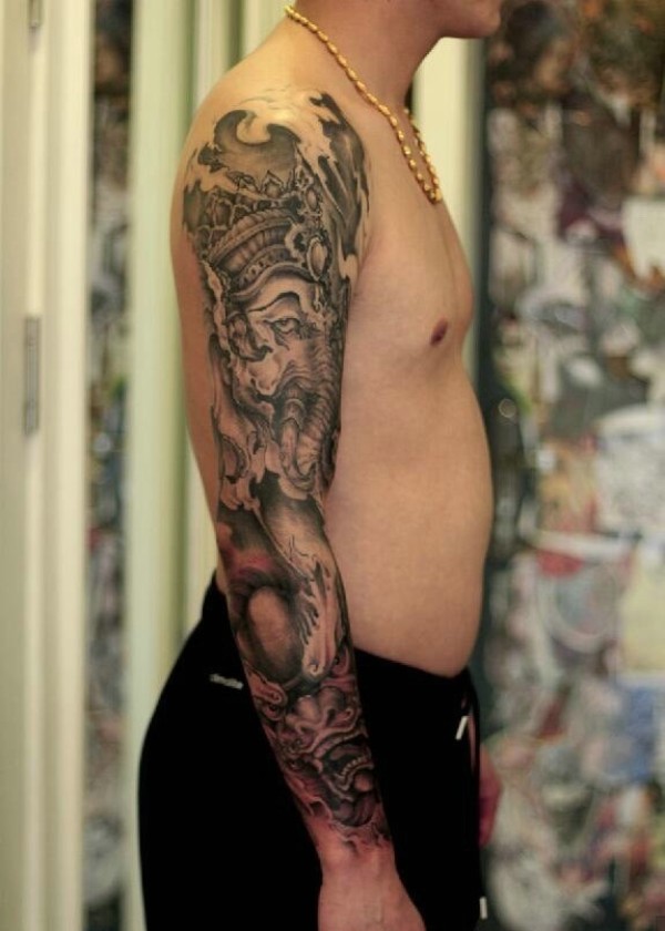 手臂黑白小象神纹身图片很个性