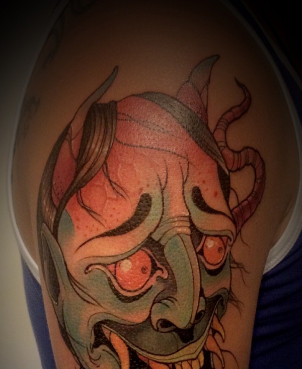 大臂彩色红般若纹身图片相当抢眼