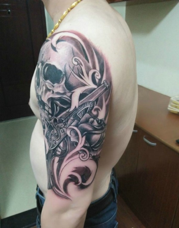 超帅时尚的黑灰骷髅与蛇纹身图案