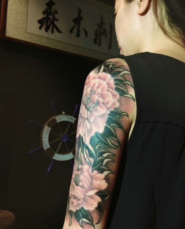 时尚漂亮的花臂牡丹花纹身图片