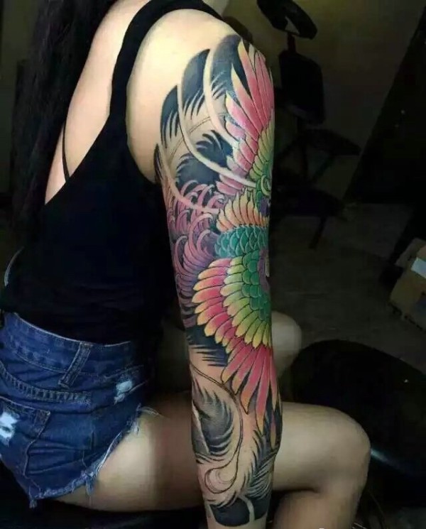 长发美女有着时尚花臂凤凰纹身图片