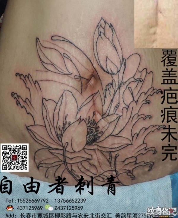 荷花覆盖疤痕纹身,长春自由者刺青