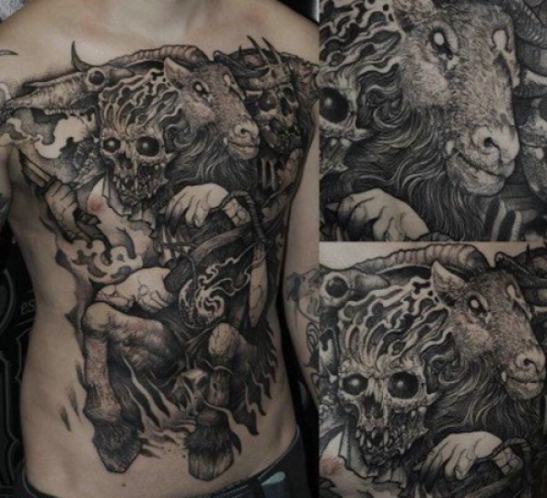 超帅时尚的黑灰骷髅与蛇纹身图案
