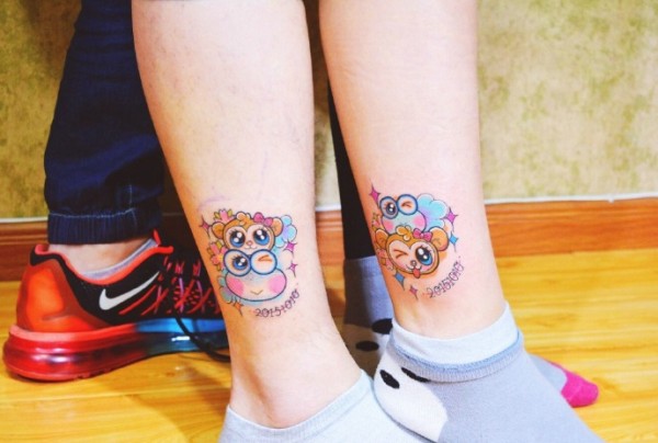 色彩缤纷的小腿卡通情侣纹身图片
