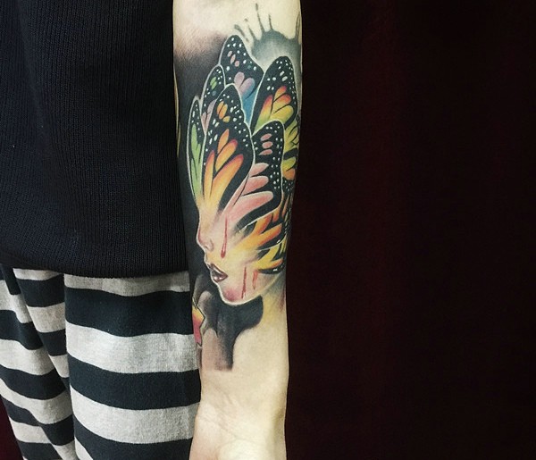 彩色蝴蝶与美女肖像混合一体的纹身图片