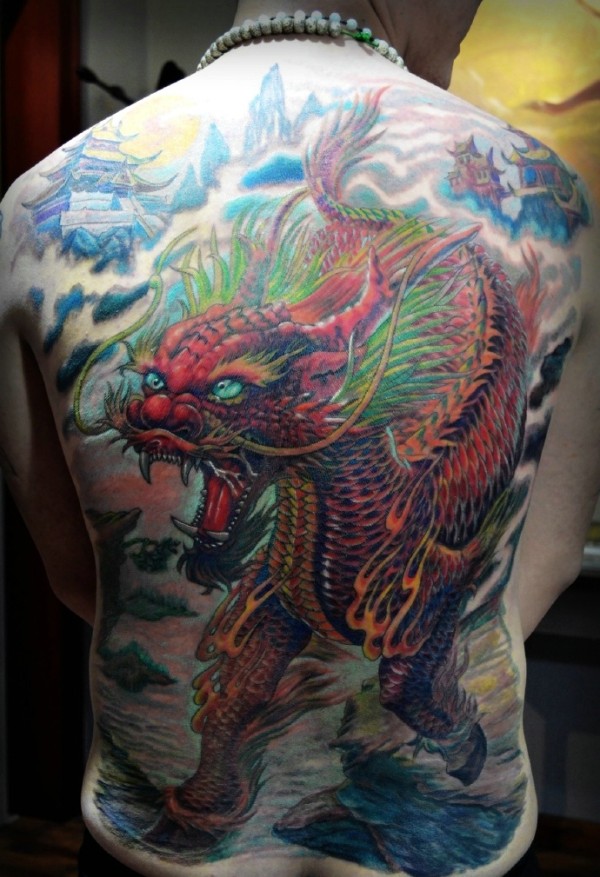 满背正能量的彩色大麒麟纹身图片