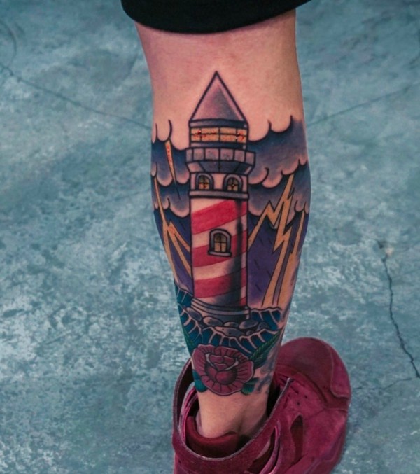 腿部个性无比的彩色灯塔纹身图片