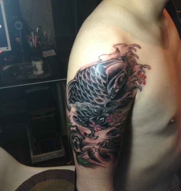 大臂活跃充肺的黑白鲤鱼纹身图片