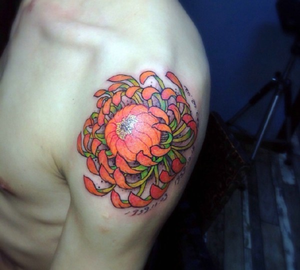 男士肩膀上的闪亮花朵纹身图片