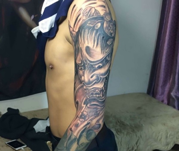 遮盖整个手臂的黑白般若纹身图片