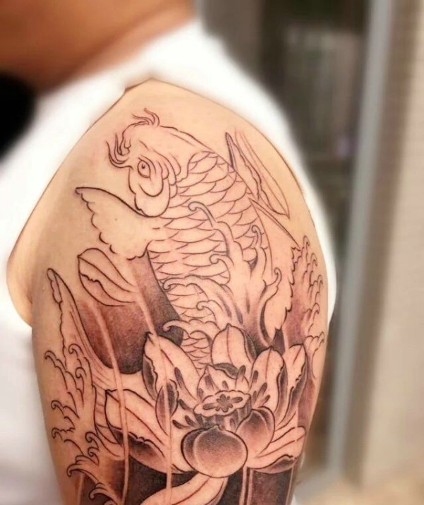 大臂未完成的线条鲤鱼纹身图片