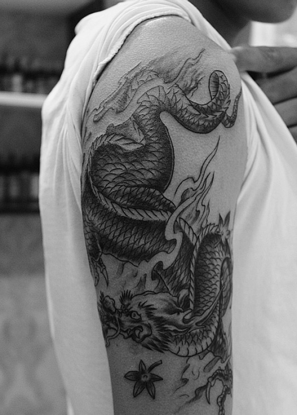 大臂黑灰邪龙纹身图片帅的不要不要的