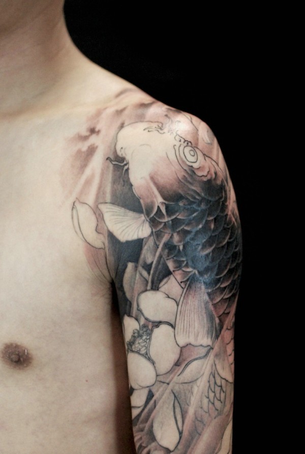 大臂水墨鲤鱼纹身图片气势十足